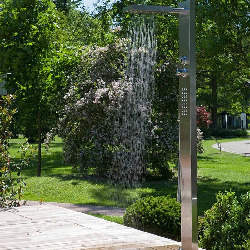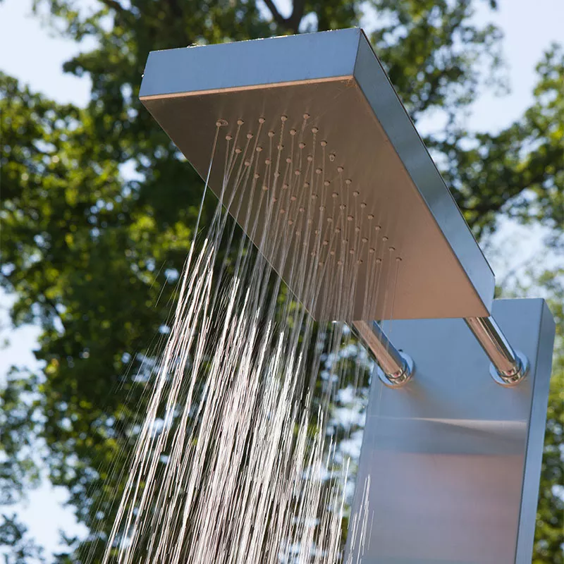De “Elba” tuindouche is gemaakt van hoogwaardig roestvrij staal. Glanzend V2A roestvrij staal gecombineerd met een uitzonderlijk design: de Elba douche is een echte eyecatcher in elke tuin.