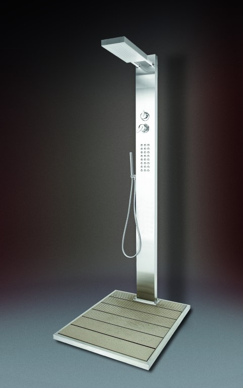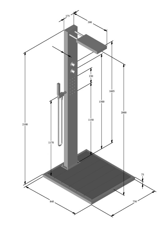 Materiaal: V2A roestvrij staal en weerbestendig hout WPC-grondplaat met V2A roestvrijstalen frame Verchroomde messing fittingen Wateraansluiting in het platform: 2 x 1/2″ binnendraad