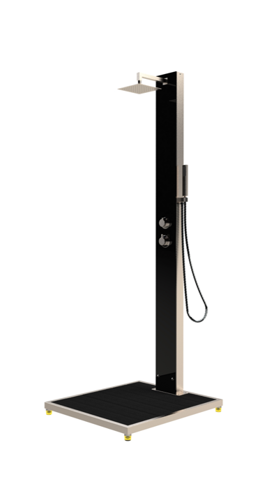 Kenmerken: Type: Warm- en koudwaterdouche Materiaal: V2A roestvrij staal Zwart veiligheidsglas, 8 mm dik Kraan: Verchroomd messing Onderstel: Houten of WPC-rooster met roestvrij staal Wateraansluiting: