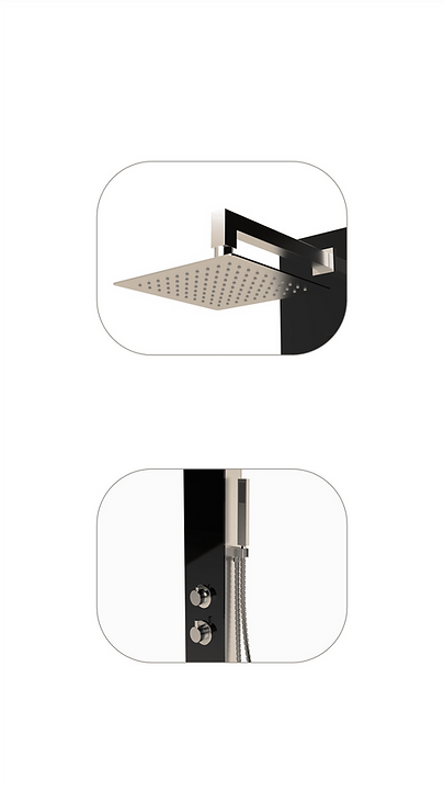 Warmwaterdouche met unieke elegantie: een combinatie van roestvrij staal en zwart veiligheidsglas.
