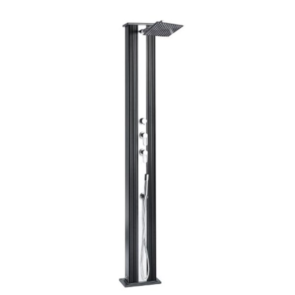 Unieke design solar tuindouche. De buitendouche “Saba” Solar is gemaakt van kostbare materialen; veiligheidsglas, roestvrij staal en een 25 liter aluminium watertank, die door de zonnestraling wordt verwarmd.