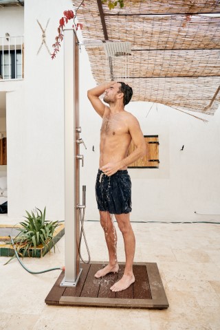 De Deze zonnedouche is verkrijgbaar in verschillende kleuren en afwerkingen en combineert milieuvriendelijke 37L zonnetechnologie met een warmwatervoorziening voor douches op de ideale temperatuur, ongeacht het tijdstip.