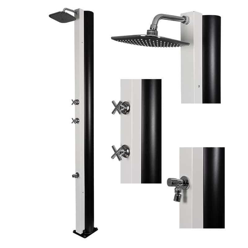 De douche kan worden geplaatst bij het zwembad, op het terras, in de tuin of bij een vakantiehuis – overal waar de zonnecollector zonlicht kan opvangen. verkrijgbaar in meerdere kleuren en beide met als zonder voetdouche.